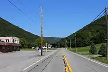 The road turns to the northeast and heads back into Halifax Township, becoming Armstrong Valley Road and running through open agricultural areas with some homes. PA 225 enters Jackson Township and runs through Fisherville, turning more to the east before heading northeast again. The road turns north to cross forested Berry Mountain, passing a quarry as it crosses into Washington Township and becomes an unnamed road.[2][3] The route curves northeast to descend the mountain into the Lykens Valley, a rural valley that is home to an Amish community, and heads into the borough of Elizabethville, becoming South Market Street and turning north into residential areas.[2][3][4] PA 225 heads into the commercial center of town and intersects US 209, becoming North Market Street at this point and passing more homes along with a few businesses. The route crosses back into Washington Township and runs through agricultural areas with some woods and homes, crossing the Wiconisco Creek. The road runs through more open farmland as it continues into Mifflin Township and becomes South Main Street. PA 225 enters the borough of Berrysburg and passes homes, crossing PA 25 and becoming North Main Street. The route heads back into Mifflin Township and becomes an unnamed road, running through more farm fields with some homes and curving to the northeast. The road turns to the north and passes through a forested gap in Mahantango Mountain, leaving the Lykens Valley. After this, PA 225 heads into the borough of Pillow and becomes South Chestnut Street, passing homes. The route turns west onto Market Street and runs through more residential areas before heading into rural surroundings.[2][3]