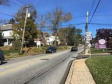 After this intersection, the road narrows back to two lanes and turns northeast into residential areas, reaching a junction with Maple Avenue.[4] PA 232 makes a curve to the north as it crosses Bristol Road into Northampton Township.[7] The route turns northeast again and continues past more housing developments with a few businesses.[4] At Richboro, the road crosses Ironworks Creek and passes shopping centers and businesses as Bustleton Pike merges into Second Street Pike and PA 232 continues due north. The route widens to four lanes and passes more commercial development as it crosses PA 332 (Almshouse Road/Newtown Richboro Road).[4][7] Following the PA 332 junction, the road narrows to two lanes and passes more residential areas, with Worthington Mill Road branching to the northeast.[4] As the route approaches the Sacketts Ford Road intersection, the settings become more rural as the road passes near farms and woods with some homes.[4][7]
