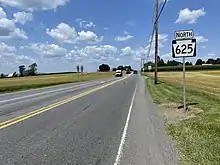 PA 625 begins at an intersection with PA 23 west of the village of Goodville and east of Blue Ball in East Earl Township, Lancaster County, heading north on two-lane undivided Reading Road.[2][3] The route passes through the Pennsylvania Dutch Country of eastern Lancaster County, which is home to many Amish farms.[4][5] The road heads through agricultural areas with some homes, passing to the east of an industrial complex before crossing the Conestoga River. The route curves northeast through more farmland with a few trees and residences and turns north to cross Black Creek into Brecknock Township. PA 625 continues through rural areas with some development before it runs through the residential community of Bowmansville. North of Bowmansville, the road passes under the Pennsylvania Turnpike (Interstate 76). The route runs through a mix of farms, trees, and residential and commercial development to the east of parallel Muddy Creek, curving to the northeast.[2][3]