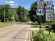PA 666 was assigned in the mass numbering of state routes in 1928.[3] This routing of PA 666 from Barnes to Nebraska, small municipalities in Forest and Warren Counties. After remaining intact for thirteen years, the highway was extended to Newmansville to terminate at PA 36 and PA 208.[4] This southern extension is now Newmansville Road, three quadrant routes, and two township roads. In 1946, PA 666 was extended westward to East Hickory, with the extension to Newmansville being decommissioned.[5][6]