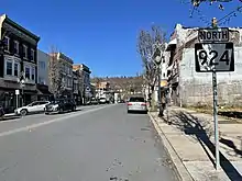 PA 924 begins at a junction with PA 61 in the borough of Frackville in Schuylkill County, heading north-northwest on two-lane undivided South Lehigh Avenue, which becomes North Lehigh Avenue upon crossing Frack Street a block later. The road passes businesses and homes in the downtown before bending west. The route heads northeast into forests and briefly runs through West Mahanoy Township before it crosses into the borough of Gilberton, where it becomes a four-lane divided highway called Gold Star Highway. PA 924 traverses the Mahantango Mountains, heading east before resuming back to the northeast. The highway passes to the west of a coal mine and comes to a bridge over the Mahanoy Creek and a Reading Blue Mountain and Northern Railroad line before it has an interchange with Main Street, which serves Gilberton. The route continues northeast near forests and coal mines, passing through a corner of West Mahanoy Township before entering the borough of Shenandoah. Here, PA 924 becomes a four-lane undivided road and passes businesses. The road crosses into Mahanoy Township and curves north in the community of Turkey Run, heading through wooded areas. The route crosses back into the borough of Shenandoah and becomes two-lane undivided South Main Street, running past homes and businesses. PA 924 heads into the downtown area and comes to an intersection with PA 54, where the name becomes North Main Street. The road continues past homes and businesses in the northern part of Shenandoah before it curves northwest.[2][3]