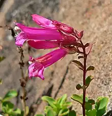 Penstemon newberryi is a species of penstemon known by the common name mountain pride[1] or Newberry's penstemon.[2] It is native to the mountains of northern California, Oregon, and Nevada, where it grows in rocky habitat, often at high elevation, such as talus. It is a bushy, mat-forming subshrub growing up to 30 centimetres (12 inches) tall. The leaves are mostly basal on the plant, oblong or oval and toothed, measuring 1 to 4 centimetres (0.4 to 1.6 in) in length, with a few smaller pairs along the stem. The glandular inflorescence bears showy magenta flowers 2 to over 3 cm (0.8 to over 1.2 in) in length. The flower is generally tubular or funnel-shaped and has a coating of short to long and curly hairs in the mouth and on the staminode.