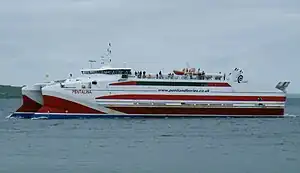 The current catamaran ferry, MV Pentalina, was built in the Philippines for the Pentland Firth, where it entered service in March 2009.[1] The ferry has a capacity of 350 passengers and either 32 cars and 8 articulated lorries or an increased number of cars, with a service speed of 18 knots (33 km/h).
