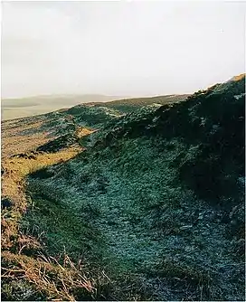 ![]() A view of the outer defence wall at Penycloddiau hill fort | |