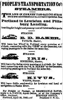 In March 1863, the P.T. Company's new steamers, the Colonel Baker, also known as the E.D. Baker, and the Cayuse, also known as the Kiyus, were nearing completion, and expected to be finished by April 1.[5] The Baker, being built at Vancouver, W.T. would run under Captain Hakes, the Iris under H.M. Knighton, and Cayuse / Kiyus under Leonard White.[5] At the same time, the steamer Reliance was said to be in a position to begin running on the Willamette River upstream from the falls.[5]