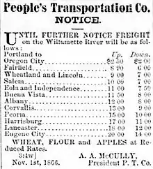 In November 1866, the P.T. Company's lowest upriver freight rate (rates were slightly lower going downriver) was $2.50 per ton for freight shipped from Portland to Oregon City.[20] Once transshipment occurred at Oregon City, freight rates increased rapidly, starting with Fairfield, at $8.90 per ton, and going up to $12 per ton for freight shipped to Albany, and $20 per ton for freight to Eugene.[20] The company's actual transshipment costs were reported to be 11 cents a ton in early 1869.[21] The company did promise reduced rates for wheat, flour, and apples.[20]