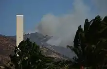 The most distinctive feature of the Malibu campus, apart from its location, is the Phillips Theme Tower, a 125-foot obelisk with an embedded cross that stands on the front lawn. The tower was designed by William Pereira in 1972, and construction was completed in 1973.[45] The tower was dedicated in 1974 as a symbol of Pepperdine's dedication to its Christian mission. Following disputes with Malibu residents over the lighting of the cross, the tower has not been illuminated since 1980.[46]