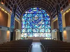 Alumni Park is located on the lowest part of the Malibu campus, adjacent to the Pacific Coast Highway. It is a 30-acre expanse of lawns, trails, hills, ponds and coral trees overlooking the Pacific Ocean.[47] Landscape architects Eric Armstrong and S. Lee Scharfman were responsible for the campus green space planning and design.[27] The park was dedicated in 1979, and it now serves as the location for the university's commencement exercises and other campus activities that need a large open space.[42] Overlooking Alumni Park is Stauffer Chapel, with its 3,000 square feet of stained-glass windows designed by Robert and Bette Donovan and constructed in 1973.[46]
