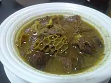 Pepper soup is a common soup in West African cuisine that is prepared using various meats, chili peppers and calabash nutmeg as primary ingredients.[2][3] Pepper soup is very spicy[4] and goes well with a cold beer or soft drink. While it is served as an appetizer at official gatherings, pepper soup is more popular at pubs. In Nigeria, it is served at "leisure spots" as a recreational or "feel good" dish.[4] Pepper soup cubes, a pre-mixed blend of spices used in pepper soup, are manufactured by one Nigerian company.[5]
