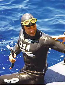 Representative and best US athlete at the Freediving World Cup in 1998 (Sardinia-Italy) with national records of constant weight (51 mt), dynamic swim (125 mt) and static breath hold (5 min.39 sec).[22][23] AIDA and PADI freediving instructor