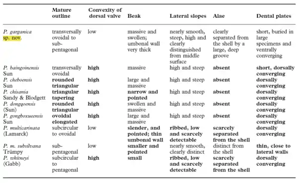 Comparisons between the morphology of Peregrinella garganica sp. nov. and all other known Peregrinella species with non-branching ribs. Major differences are in bold.[9]