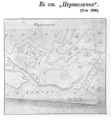 Perevolochna (Ukrainian: Переволочна) is a former fortress and town in the Polish–Lithuanian Commonwealth and Cossack Hetmanate, and later a village in Poltava Oblast. Before the establishment of Kamianske Water Reservoir in the 1960s, here also existed a river crossing. The settlement was situated at the bank of the Dnieper near the mouth of Vorskla River,[1] where a ford across Dnieper enabled people to cross the river, hence its name.[2] The crossing Perevolochna – Mishuryn Rih was also a key crossing during the Battle of the Dnieper in October 1943.