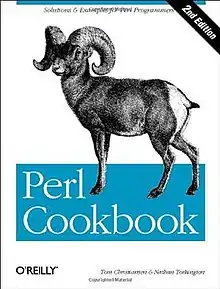 The Perl Cookbook, ISBN 0-596-00313-7, is a book containing solutions to common short tasks in Perl. Each chapter covers a particular topic area ("Strings", "Ties, Objects, and Classes", "CGI")[1] and is divided into around a dozen recipes each on a particular problem ("Reversing A String By Word Or Character", "Accessing Overridden Methods", "Managing Cookies"). Each recipe has four parts: "Problem", "Solution", "Discussion", and "See Also".