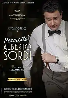 Permette? Alberto Sordi (lit. 'Pardon? Alberto Sordi') is a 2020 Italian film directed by Luca Manfredi. The film narrates the twenty years of Alberto Sordi's life, from 1937 to 1957, from his beginnings to his celebrity, retracing his friendships, loves and his career; the film is one of the initiatives planned for the centenary of the birth of the Roman actor.[1]