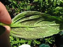 Peronospora belbahrii, common name basil downy mildew, is a pathogenic water mold that affects basil species. Rapidly spread by windborn spores, the pathogen was first discovered in Italy in 2003.[1] In 2007 it was detected in Florida and by 2008 had already spread to outdoor and greenhouse basil crops in the United States and Canada.[2] Infections are untreatable and usually lead to complete crop loss, although multiple mildew-resistant cultivars have been developed and are now available for commercial and home growers.[3] Leaves from affected plants are unmarketable due to their unappetizing appearance, but remain safe for human consumption.[4]