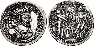 Like his predecessor Ardashir I Kushanshah, Peroz is called the "Great Kushan King" and "Mazdean (Zoroastrian) lord" on his coins.[7][8] In some of the rare coins of Peroz, the "Investiture issue", minted at Herat (HLYDY), the obverse legend reads mzdztn bgy pylwcy rb’ kwš’n mdw’ in Pahlavi, "The Mazda-worshipping lord Peroz the Great Kushan Shah".[9][lower-alpha 1][lower-alpha 2] On the reverse, Peroz is seen standing on the left, facing Anahita rising from her throne. Peroz is holding an investiture wreath over an altar and raising the left hand in gesture of benediction. Anahita also holds an investiture wreath and a scepter.[8]