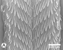 Digestive system: Teeth of the radula are arranged in anteriorly V-shaped rows.[1]