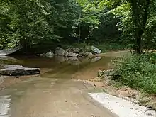 The Tennessee River forms the western border of Perry County, dividing it from Decatur County and Benton County.[74] It flows south to north and is navigable through the entire length of the county.[75] In 1944, with the construction of Kentucky Dam, portions of low-lying land adjacent to the river were inundated, although the societal and environmental impact was substantially lower than areas farther downstream.[76] While the presence of the dam allows for some level of control against regular, catastrophic flooding along the basin, some areas of the western portion of the county do flood. At the National Weather Service designated flood stage of the river, portions of the county near Crooked Creek are inundated. At moderate and major flood stages, bottomland near Mousetail Landing State Park, Deer Creek, and Cedar Creek are inundated.[77]
