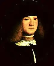 The only historical document concerning Leonardo's sexual life is an accusation of sodomy made in 1476,[21] when he was almost 24, and still at the workshop of Verrocchio.[22] Florentine court records show that on 9 April 1476, an anonymous denunciation was left in the tamburo (letter box) in the Palazzo della Signoria (town hall) accusing a young goldsmith and male prostitute, Jacopo Saltarelli (sometimes referred to as an artist's model) of being "party to many wretched affairs and consents to please those persons who request such wickedness of him". The denunciation accused four people of sodomizing Saltarelli: Leonardo da Vinci, a tailor named Baccino, Bartolomeo di Pasquino, and Leonardo Tornabuoni, a member of the aristocratic Tornabuoni family. Saltarelli's name was known to the authorities because another man had been convicted of sodomy with him earlier the same year.[23] Charges against the five were dismissed on the condition that no further accusations appear in the tamburo. The same accusation did in fact appear on 7 June, but charges were again dismissed.[24]