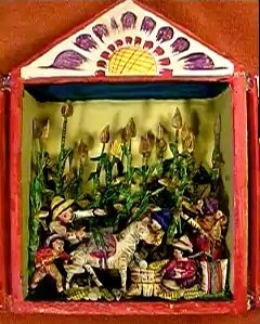 Retablos are a sophisticated Peruvian folk art in the form of portable boxes which depict religious, historical, or everyday events that are important to the Indigenous people of the highlands. It is a tradition originated in Ayacucho.