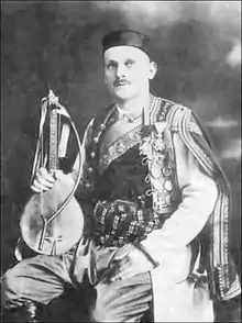 Perunović was born in 1880 at Drenovštica in Pješivci, Princedom of Montenegro, and at an early age displayed an exceptional skill for the gusle, an ancient Balkan instrument.[3] He began taking lessons, given by his mentor Ilija Kontić, at the same time that he was attending grammar school in his native village. In 1900 he left Montenegro for Šabac, Serbia, where his music instructor was R. Tolinger. He brought himself to notice in Belgrade in 1908 by performing before a colossal monument to Prince Mihailo in protest against the Bosnian crisis.[4] In Negotin, he graduated from Teacher's College in 1910. His teaching career was interrupted by the two Balkan wars and World War I in which he took an active part. Petar was a brave soldier and a respected Serbian officer. He fought from 1912 to 1918. On his chest, all the decorations are easily recognizable, including the star of Karađorđe with swords of the fourth order, being the most coveted.