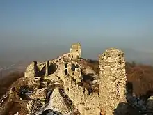 Following the Battle of Rozgony on 15 June 1312, Peter and his servants presumably participated,[16] which brought an end to the Aba family's rule in Northeast Hungary, Peter was made ispán of Zemplén and Ung counties by Charles I.[17] As part of his dignities' honor, he was also granted the castles of Gönc (Amadeus Aba's former seat) and Regéc, where he served as castellan (with the title of comes).[18] Kádár questions the latter position.[19] A later source from 1345 refers to him as "ban", thus he possibly held a such dignity sometime between 1312 and 1315, or it was a honorary title.[9] According to historian Gyula Kristó, Peter exploited that political vacuum, which emerged following the dissolution of the Abas' dominion in the upcoming years, and began to establish a de facto independent province in Zemplén and partly Abaúj counties. Thus Kristó considered him one of the so-called "oligarchs" or "provincial lords".[20] Peter continually distanced himself from the royal power and entered as a local tyrant against the neighbouring noblemen. For instance, he plundered the lands of the royalist Nagymihályis (descendants of the Kaplon kindred) in late 1315.[21][22] He cooperated with his former enemies, the sons of the late Amadeus Aba, and their joint troops besieged and destroyed the castles of Györke and Nagymihály (today Ďurkov and Michalovce in Slovakia, respectively). Peter's henchmen also tortured and murdered some of the Nagymihályis' relatives and servants.[23] Peter possessed approximately 50 villages and six castles by that time.[16] In November 1316, it was reported the members of the Rozgonyi family (Básztély clan) have been "defending Csicsva Castle [today part of Sedliská, Slovakia] for almost a year" against Peter's banderium.[24]