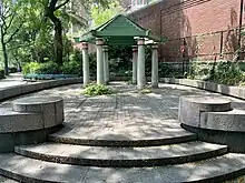 Before his death, Detmold and other community members had been calling for improvements to the park but New York City's fiscal crisis and a lack of municipal funds during the 1970s prevented any significant upgrades. One of the local civic leaders who kept pushing for improvements was James Amster.[12] On October 21, 1986, a groundbreaking ceremony was held to mark the start of a $794,000 project to renovate the park, which was attended by elected officials, community residents, and the twin daughters of Peter Detmold. Improvements included the installation of new benches, lighting, pavement, trees and shrubs, and underground utilities. A landscaped berm was also created to serve as a noise and visual barrier from traffic on the FDR Drive. Other additions made to the park included a gazebo situated within a centrally-located granite pavilion and a pergola near the southern entrance to the park.[1][17][18] The restoration was completed the following year and a grand opening was held on October 2, 1987, that included Parks Commissioner Henry Stern dedicating the gazebo to James Amster.[12][19] Amster had died in June 1986 at the age of 77, just a few months before the start of the renovation project.[20]