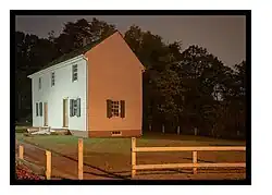 The Peter Mott House is now the oldest standing residence in Lawnside, with current dimensions of approximately 15 by 40 feet (4.6 by 12.2 m). It is a compact rectangular wooden structure with two stories and a gable roof, constructed in two phases around 1845 and 1870.[7] The older part (southern side) features a full basement supported by brick and stone masonry foundation walls, while the newer section (northern side) has a shallow crawl space and brick foundation that maintains the original design. Inside, the house's interior corresponds to the unassuming exterior.