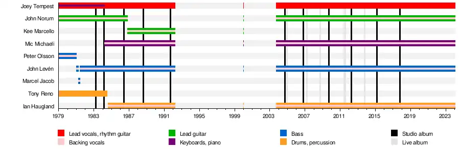 The first incarnation of the band was named Force and came together in 1979, in Upplands Väsby, Stockholm, and was integrated by vocalist Joey Tempest, guitarist John Norum, bass guitarist Peter Olsson, and drummer Tony Reno.[11] "I remember when we started the band Force we were playing covers in the rehearsal room, because we just wanted to learn our instruments, like all bands," Tempest said, "Then one day I said maybe we should do our own stuff. Nobody had any ideas, so I brought mine into the rehearsal room, and that is when we started writing our own stuff."[12]