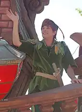 Disney originally wanted Mary Martin, who was appearing in a stage production of the original play, to voice Peter Pan, while Jean Arthur also contacted him about being considered.[26] Bobby Driscoll, who was Disney's first contract child actor and had previously starred in such films as Song of the South (1946), So Dear to My Heart (1948), and Treasure Island (1950), was ultimately cast.[33] This was the first time that a male actor was cast as Peter Pan, breaking a tradition of women portraying him in both films and stage productions.[14] Driscoll also provided some of the live-action reference for the character.[4] Peter Pan was Driscoll's last Disney film, as his contract with the studio was abruptly terminated shortly after its release.[34]