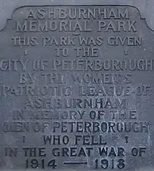 The land upon which the museum resides was donated to the City of Peterborough and is more formally known as Ashburnham Memorial Park. A plaque at the summit reads, "This park was given to the City of Peterborough by the Women's Patriotic League of Ashburnham in memory of the men of Peterborough who fell in the Great War of 1914–1918."