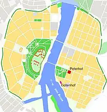 The Peterhof or Petershof (Middle Low German and current German for "Peter's courtyard", Russian: немецкий двор, Latin: curia sancti Petri) was the Hanseatic kontor, one of the four major trading posts of the Hanseatic League, on the right bank of the Volkhov at Novgorod, Russia, then forming the Novgorod Republic.[1]: 99 It was named after St. Peter's Church, a Catholic church that was used by the Hanseatic merchants. It eventually consisted of two parts, the palissaded enclave, called the Peterhof proper, further uphill from the river Volkhov, and a beachyard, the Gotenhof, on the river that was eventually included in the Peterhof.[2]: 132 Baltic trade, including Novgorod's trade, was dominated by the Hanseatic League from the 13th to 15th centuries. It was first shut down in 1494 by Ivan III of Russia, but later reopened although a terminal decline could not be halted.