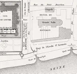The Hôtel du Petit-Bourbon, a former Parisian town house of the royal family of Bourbon, was located on the right bank of the Seine on the rue d'Autriche,[1] between the Louvre to the west and the Church of Saint-Germain l'Auxerrois to the east. It was constructed in the 14th century, not long after the Capetian Kings of France enlarged the fortress of the Louvre in order to use it as a royal residence. On two 1550 maps it is shown simply as the Hôtel de Bourbon, but by 1652, as the Petit-Bourbon on the map of Gomboust (see below).[2] The Bourbons took control of France in 1589, at which time they also acquired the Louvre.