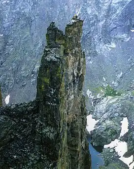 Petit Grepon is a semi-detached spire in Colorado's Rocky Mountain National Park. It is one of the "Cathedral Spires" which also includes: Sharkstooth, The Saber, and The Foil. The South Face route of Petit Grepon is described in the historic climbing text Fifty Classic Climbs of North America[3] and considered a classic around the world.[4]