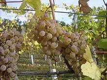 Petit Manseng (sometimes translated: Small Manseng, rarely "Little Manseng") is a white wine grape variety that is grown primarily in South West France. It produces the highest quality wine of any grape in the Manseng family. The name is derived from its small, thick skin berries. Coupled with the small yields of the grapevine, most Petit Manseng farmers produce around 15 hl of wine per hectare. The grape is often left on the vine till December to produce a late harvest dessert wine. The grape is grown primarily in Gascony, Jurançon and around Madiran (for Pacherenc du Vic-Bilh) but has recently drawn interest in New World wine regions like California, North Georgia, Virginia, and Ohio. In May 2020, CSIRO scientists discovered through DNA analysis that Australia's plantings of Petit Manseng, first imported in 1979, are in fact Gros Manseng.[1] The reason is that it is expected to follow Viognier's path to popularity among white wine drinkers.[2] It was already present in Uruguay, when Basque settlers brought "Manseng" and Tannat vines with them to their new home. Despite being easily recognizable as a white grape while true Manseng is a black grape, wine that is Petit Manseng is still normally labeled as just "Manseng". The grape is often left on the vine to produce a late harvest wine made from its nearly raisin like grapes.[3]