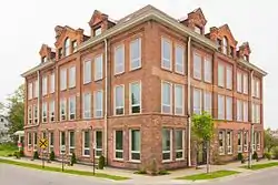 The Zipp Lumber Company Building is a three-story brick Queen Anne commercial structure built on a trapezoidal plan, with pedimented dormers and a hipped roof. The trapezoidal plan accommodates the irregular lot adjacent to the railroad tracks. The walls are paneled to simulate pilasters. Windows are one-over-one wood framed units.[2]