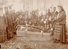 A mass exodus to Turkey by the Pomaks in the region started after the Unification of Bulgaria in 1885. They moved mostly to the regions of the cities Çorlu in East Thrace and Hasanbey in Balikesir in Anatolia.[24] Their property and estates were thereby bought, transferred to, or abandoned and acquired by the remaining population.[3] A Pomak school opened briefly in the village of Blasnichevo to encourage Pomaks to remain in their locations. In 1893 only 22 Pomaks remained in Petrevene. The entire Pomak population left the village by 1898.[25][26] Several Italian quarrymen settled in Petrevene at the beginning of the 20th century. They created, in particular, many skillful gravestones, still standing in the village cemetery.