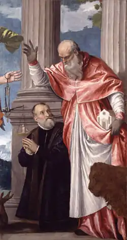 Set above the altar in their burial chapel, Veronese's painting shows donor portraits of the two men protected and presented to Christ by their name saints. The cousins are privileged to witness a miraculous apparition, a foretaste of the future: the archangel Saint Michael, who will weigh the souls of the dead at the Last Judgment. Above, we see the dead Christ, who died to redeem mankind. Veronese offered his patrons a compellingly realistic depiction of a visionary scene, and captured the hope of the faithful Christian for salvation. The angels carry three of the Instruments of the Passion.[2]