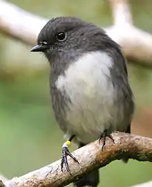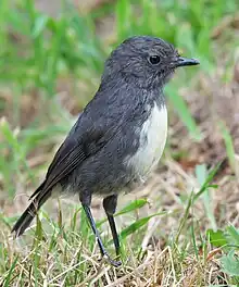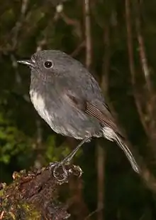 The South Island robin (Petroica australis; also known in Māori as the kakaruwai)[2] is a sparrow-sized bird found only in New Zealand, where it has the status of a protected endemic species. The birds are sparsely distributed through the South Island and Stewart Island/Rakiura, although the distribution is not continuous. The nominate, and the Stewart Island robin (P. australis rakiura) are the two subspecies. The species is closely related to the North Island robin (formerly P. australis longipes, now considered a distinct species),[3] and also to the extremely rare black robin (P. traversi) of the Chatham Islands.