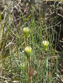 Petrophile acicularis is a tufted shrub that typically grows to a height of 15–70 cm (5.9–27.6 in) and has glabrous branchlets and leaves. The leaves are cylindrical, 50–180 mm (2.0–7.1 in) long and 1–1.5 mm (0.039–0.059 in) wide. The flowers are arranged in sessile, oval heads about 15 mm (0.59 in) long, with many pointed involucral bracts at the base. The flowers are about 10 mm (0.39 in) long, cream-coloured and densely hairy. Flowering occurs from September to October, and the fruit is a nut, fused with others in a more or less spherical head 15–20 mm (0.59–0.79 in) long. This petrophile differs from similar species in having prominently striated cone scales.[2][3][4]