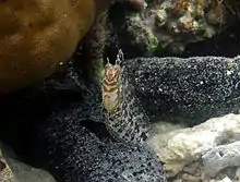 Petroscirtes is a genus of combtooth blennies found in the western Pacific, and Indian oceans. Some species of this genus have venom that interacts with opioid receptors.[2] Adults usually inhabit coastal reefs and estuaries to depths of about 10 meters,[3] but they can also be found up to 15 meters in depth in sandy and weedy areas among clumps of Sargassum or other seaweeds in coastal and lagoon reefs. They can be found in nests inside small-necked bottles and abandoned worm tubes or shells.[4]