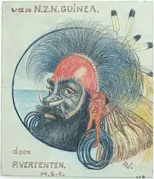 Vertenten was also a competent amateur ethnologist who wrote down his findings with great empathy for the cultures in which he had to immerse himself. He wrote hundreds of small articles in mission magazines, but also made more technical contributions in anthropological journals. His best known work is Fifteen Years with the Headhunters of Dutch South New Guinea (Vijftien jaar bij de koppensnellers van Nederlandsch Zuid-Nieuw-Guinea). In addition, Vertenten was a creditable draftsman and painter.[9] He made many sketches and portrait studies in both New Guinea and Congo.[10] His oil paintings and crayons of the Marind-anim men and women, whether or not in full ritual attire, are perhaps the first full-color representations of a Papuan culture. After his death, a large part of his oeuvre, as well as a meticulously maintained archive, were preserved in the mission house in Borgerhout, where Vertenten's career had started. In 2001 this estate was taken over by the Tropenmuseum in Amsterdam, where a number of the paintings can be seen in the semi-permanent exhibition. The archive was moved to the Catholic Documentation Center (Katholiek Documentatie Centrum) of Radboud University Nijmegen.[11]