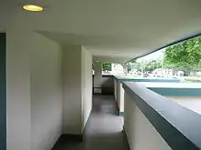 The interior is adorned with a fireplace at the T's crossing point. The cross of the T is an open-air, covered porch. The porch not only incorporates the open terrace common to other Wright designed buildings of the era but also has an explicit functionality. Wright meant for the porch to be used by those attending funerals while they waited for cars.[5] The placement of the columns on the porch, pulled back from the open corners is found on other Wright buildings such as the Coonley House and the Martin House. The column placement and Wright's drawings may have influenced European architects after 1910 such as Le Corbusier.[6] The wood framed building's partial basement contains restrooms, storage, and a furnace room, although the building was originally unheated.