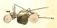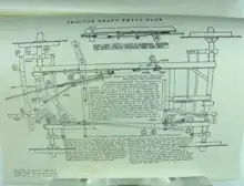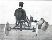 A subsequent prototype plough was constructed using the front axles from two T Model Fords.[1] All four wheels were steerable. Front and rear wheels turned independently of each other. The tyres were removed, and the plough ran on the rims of the wheels, which had wooden spokes. The main structural members of the plough were made from 4-inch hardwood, joined at each end by specially made steel strips bolted to the timber. The operator sat on the plough and steered using a series of levers and foot controls.