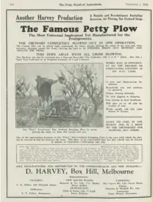 - ↑ 'Harvey "Petty" Orchard Disc Stripping Plow', Daniel Harvey Limited, Box Hill, Melbourne, Victoria Bulletin No 8, Page 2, Circa 1935, Museum Victoria Collection