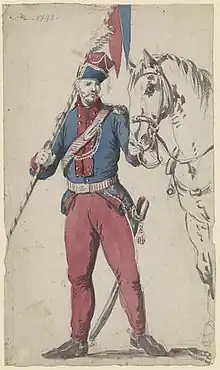 In 1717, in the Grand Ducal Lithuanian Army, the petyhorcy were the most numerous cavalry, having a total of 26 banners.[2] During the military reforms of 1775–1776, all Hussar and Petyhorcy flags, of which there were 32 in total, were merged into two National Cavalry brigades of 16 flags each.[2] The second one was the 2nd Lithuanian National Cavalry Brigade, also called the 2nd (Pinsk) Petyhorcy Brigade, which had about 380 soldiers.[2] In 1789, it numbered 1635 and was composed of 17–32 banners.[2] This brigade was deployed in the eastern lands of the Grand Duchy of Lithuania, on the Russian border.[2] During wartime, the brigade was redeployed.[2] During the War of 1792, part of the brigade's banners were located in the Russian occupation zone and hence were disbanded.[2] The last time the Petyhorcy fought were in the Kościuszko Uprising.[2]