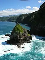 This plant, the only Peucedanum found in the Hawaiian Islands, grows in coastal canyons and on cliffs overlooking the ocean. There are two small populations in the Waianae Range of Oahu, three on Molokai, ten on Kauai, and one on Keopuka Rock, an islet close to the coast of Maui.[2]