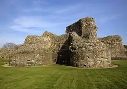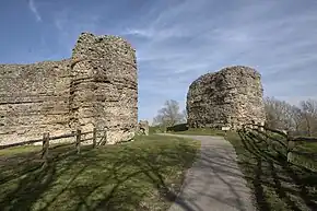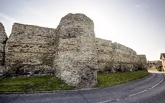 The castle's curtain wall is built on a massive scale, with ramparts and projecting towers still standing up to 8.2 metres (27 ft) high (and probably about 9.5 metres (31 ft) high when built) and 4.2 metres (14 ft) thick at the base.[9] The north, east and west sections of the curtain wall have survived mostly intact, with the exception of one fallen segment of the north wall; the south wall, which would have adjoined sea or marsh, has almost entirely disappeared.[10] It is faced with ironstone and sandstone, though most of the original facing stones have been robbed out over the centuries; the structure visible now consists mostly of the rubble and sandstone core, bound together with mortar. Bonding courses of tiles run horizontally through the wall.[7] An impression of its original appearance can be gleaned from an area in the north wall which has been excavated down to the still-intact foundations, revealing how it was once faced on both sides with small blocks of stone.[11] The wall originally had a stepped appearance with at least two levels of steps on the interior face, though there is no surviving indication of how the garrison reached the top.[5] At the top of the wall the remains of medieval crenellations can still be seen, which probably replaced Roman originals.[7]