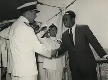 ![]() Vice-Admiral Sir Peveril William-Powlett (left) receiving the Prime Minister of the Gold Coast, Dr. Kwame Nkrumah, when paying a courtesy visit to HMS 'Euryalus' in the Accra roads. | |