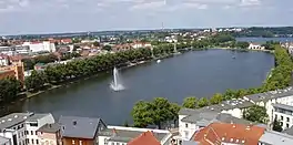 Pfaffenteich is a pond in Schwerin, Mecklenburg-Vorpommern, Germany. At an elevation of 39.2 m, its surface area is 12.3 hectares (30 acres).